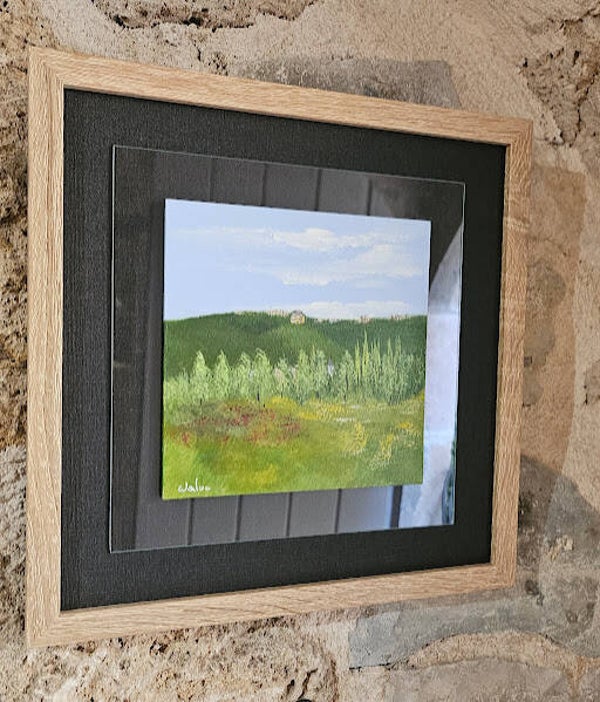 Petit tableau peint sur médium de bois collé sur une plaque de verre, elle même collée sur un fond en papier peint gauffré couleur antracithe .
